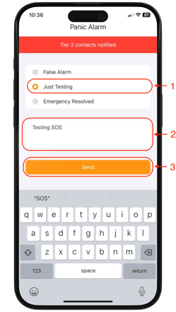 3. Next, you will be prompted to select a reason for sending the All Clear. For reporting purposes, you'll need to choose from one of the three options, and it is recommended that you briefly describe why the alarm went off. Then, tap "Send." (In the example below, the worker was testing SOS)