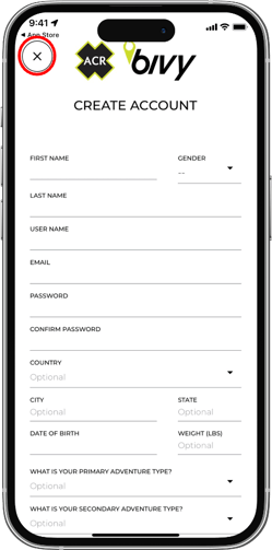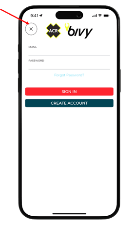 - Next, you will be prompted to create a Bivy account. However, you do not need to create one. Simply close the prompt by tapping the “X” button located in the top left corner, or skip this step.