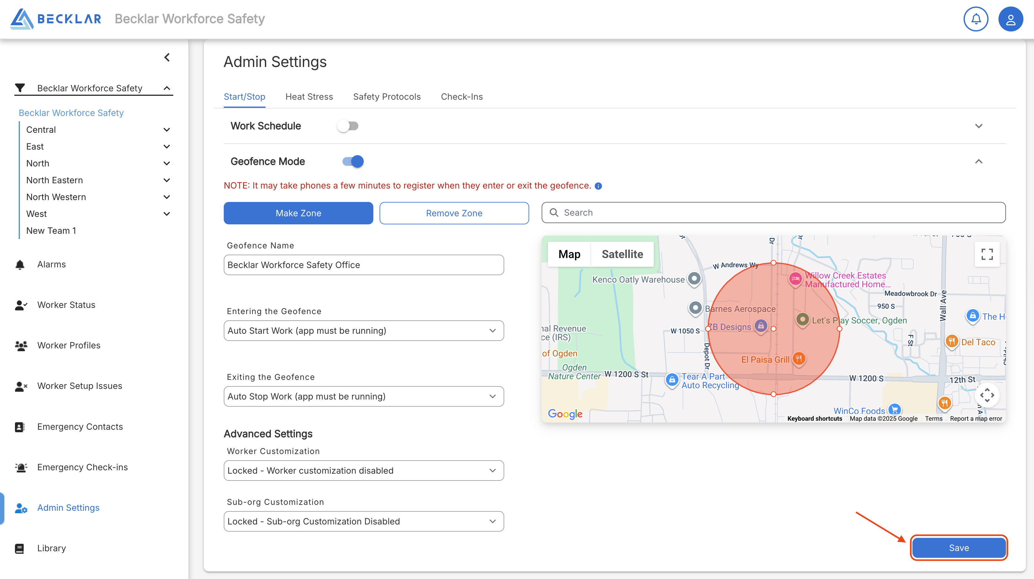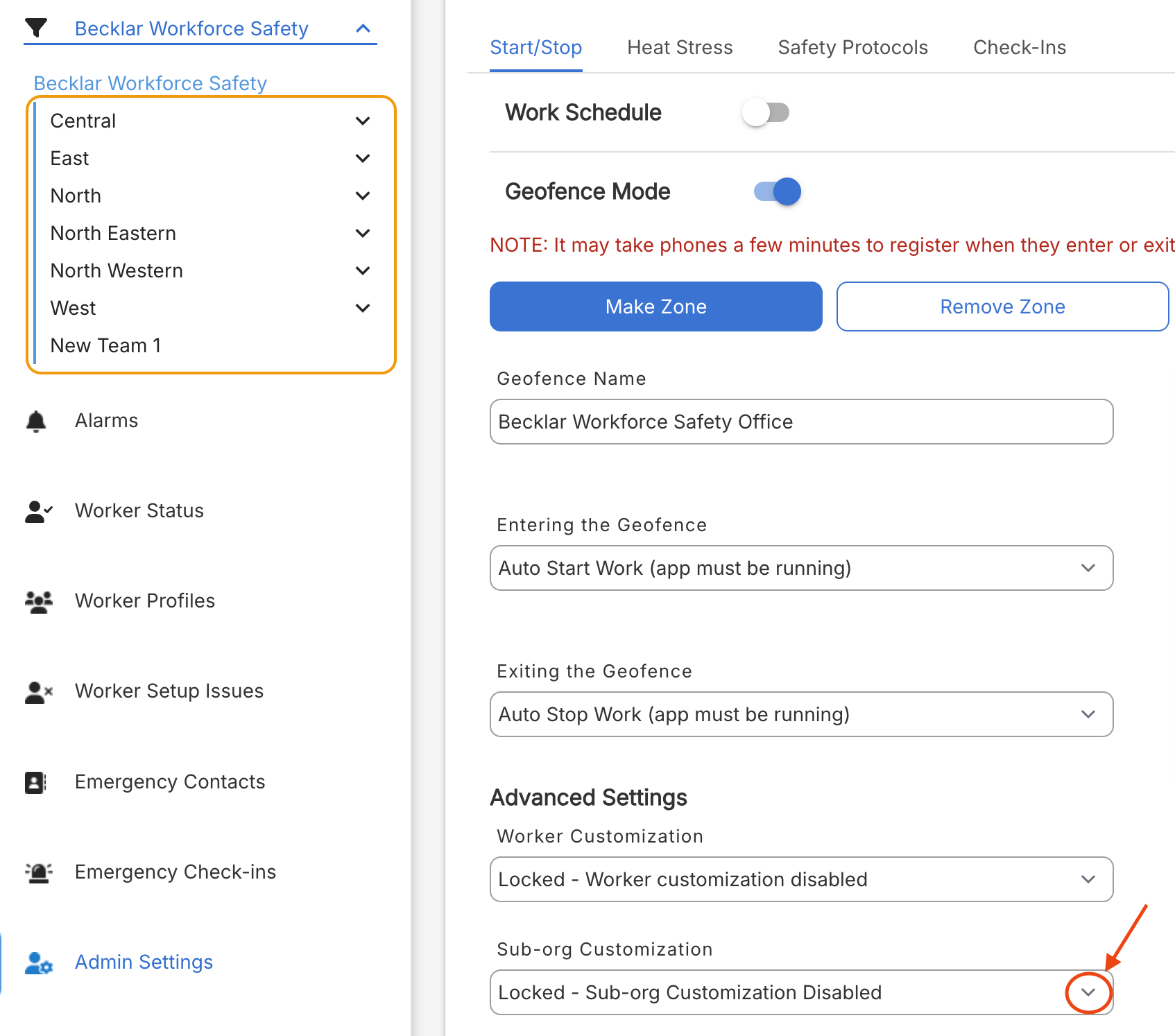 - Click the drop-down arrow under "Sub-org Customization" and select "Locked - Sub-org Customization Disabled" to apply this geofence to all subgroups under the team you are currently creating the geofence for. In this example, all the sub-teams under the parent team "Becklar Workforce Safety" will have this geofence enabled for them. If not, select "Unlocked - Sub-org customization enabled"