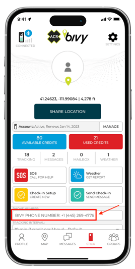 Each Bivy satellite device has a dedicated phone number. When you use the Bivy messaging tool, text messages will be sent from that number. It is located in the "STICK" tab on the Bivy app.