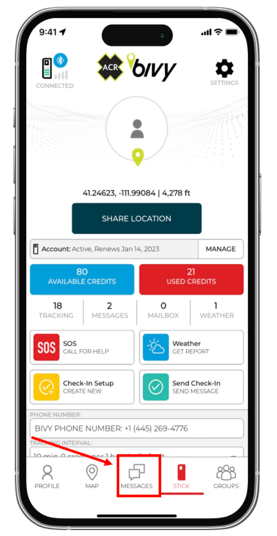 Note: A Bivy satellite device must be connected to your Bivy app before you can use the messaging tool. Click here for instructions on how to do so.