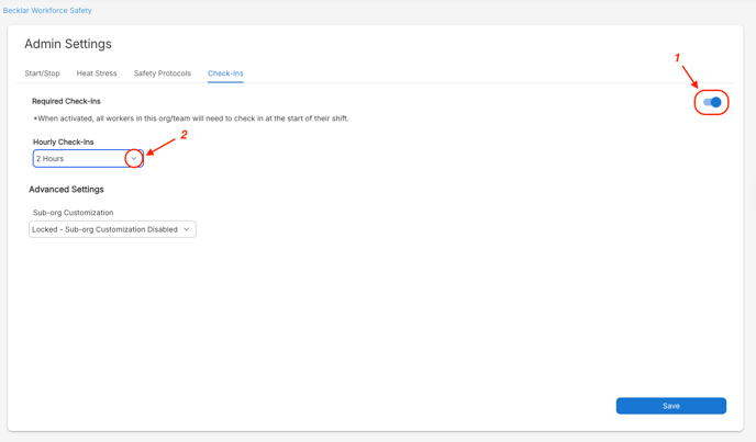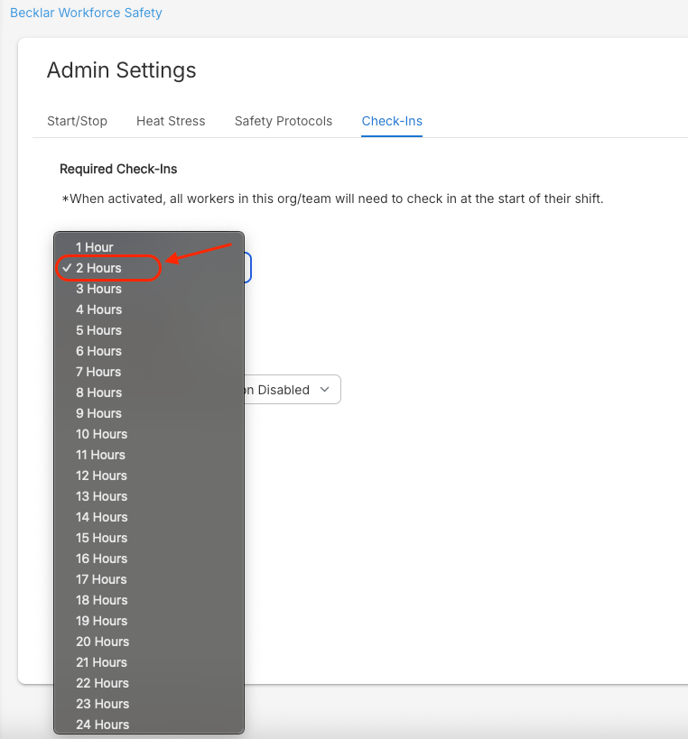 3. Click on the button to toggle "Required Check-Ins" on. Then click on the drop-down arrow to select the Required Check-In interval.