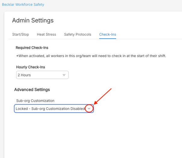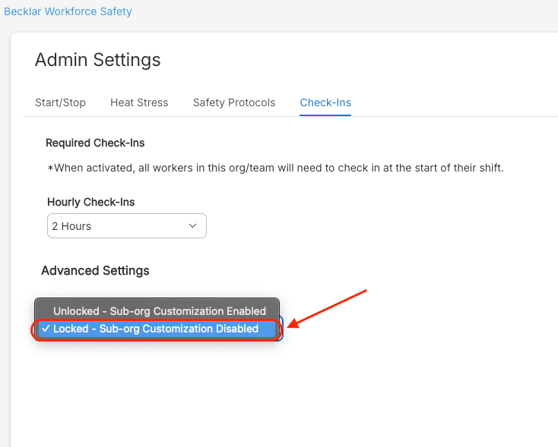 5. Click the drop-down arrow under "Sub-org Customization" and select "Locked- Sub-org Customization Disabled" if you want orgs/teams under the org for which you are creating the required check-in also to have the same required check-in. If not, select "Unlocked- Sub-org Customization Enabled" if you want sub-orgs/teams to be able to set their own Required Check-ins (In this example, the admin has selected "Locked- Sub-org Customization Disabled")