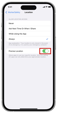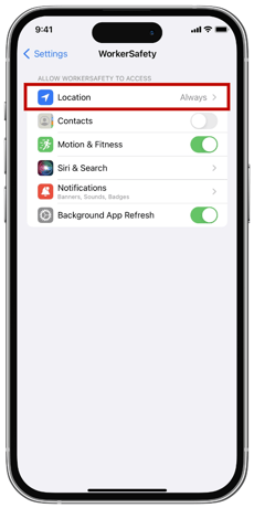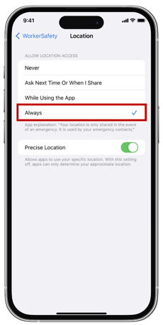 WorkerSafety Pro requires location access set to “Always” in order for the app to function properly and keep you safe.
