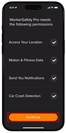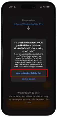 If you would like to allow WorkerSafety Pro to create an alarm if a crash is detected from an iPhone (14 or newer), tap “Inform WorkerSafety Pro”.