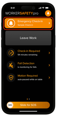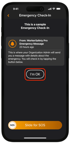 Once you have entered the home screen of the app you may see an orange banner at the top of the screen that says "Sample Emergency Check-in". This is just a sample and will not notify anyone. Please tap on the orange banner and then tap "I'm OK".