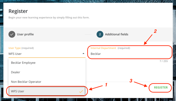 4. On the next screen, click the drop-down arrow in the "User Type" section, then select "WFS User". Type the name of your organization in the "Internal Department" field, then click "REGISTER."